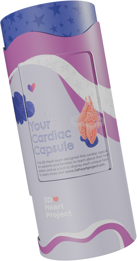The Cardiac Capsule is our newest addition to the 3D Heart Project! The Cardiac Capsule is designed to be a special take-home artifact that helps patients visualize and display their own special heart. When requested, the design team will 3D print the patient's heart and will provide a Cardiac Capsule for the patient. Each Cardiac Capsule features the 3D model, a display light, and includes educational activities, stickers, and a first aid pouch should their heart need a repair.